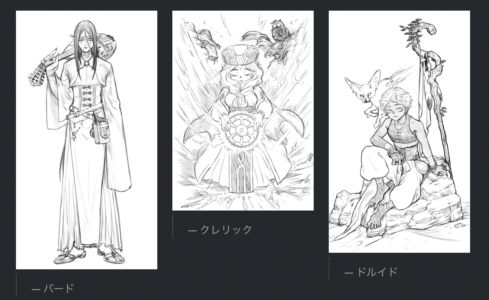 『ダンジョン・ワールド』では、プレイヤー達はセッションの冒頭で一緒にキャラクターを作成していくことになります。事前にキャラクターの設定を考えてセッションに参加するのではなく、参加者全員で会話を交わしながら自PCを作っていく中で、自然とその場のノリでPC同士の思いがけない設定が生まれていくのも、『ダンジョン・ワールド』のキャラメイクの面白さの一つです。また、PC同士で同じクラス(全部で9種類)を選択できないというルールもあるため、役職が被らず、パーティの全員が個性を発揮できるようになっています。
